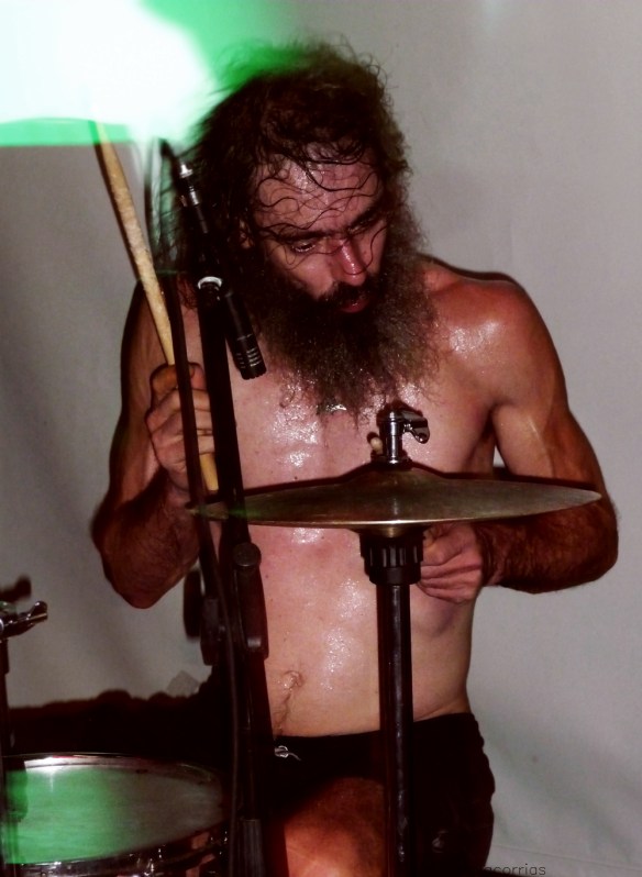 Ai tamburi, il gigione dei Pitura Freska; denudato, scarnificato, desimpatizzato, phonato e termoriscaldato tanto da far gocciolare per mezzo concerto un asciugamano, zozzissimo, appeso a un’asta da crash.