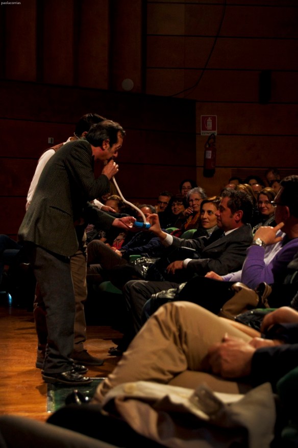 L’istrione lucano si trova in sala ben prima dell’inizio, tra gli spettatori, per dare una mano ad accomodarsi, fare due chiacchiere. Un personaggio del tutto alla mano e a suo agio anche nel ruolo dello scaldapubblico.